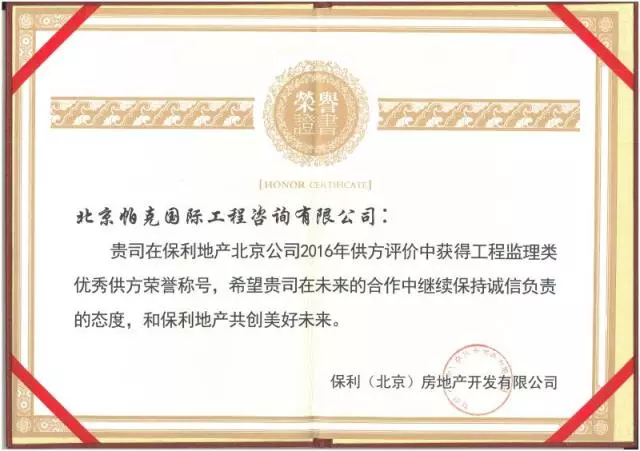 2016年,帕克国际通过优质的服务、精良的技术、敬业爱岗的工作态度,赢得了保利颁发的“工程监理类优秀供方”的称号。2017年,帕克国际必将延续过往的优良传统,誓必蝉联此称号。