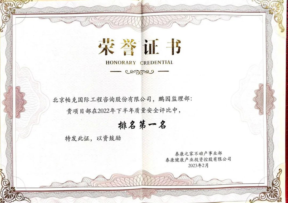 新年开工深圳传喜讯,帕克国际监理的深圳泰康之家鹏园颐养苑项目荣获泰康2022年下半年质量安全评比第一名。