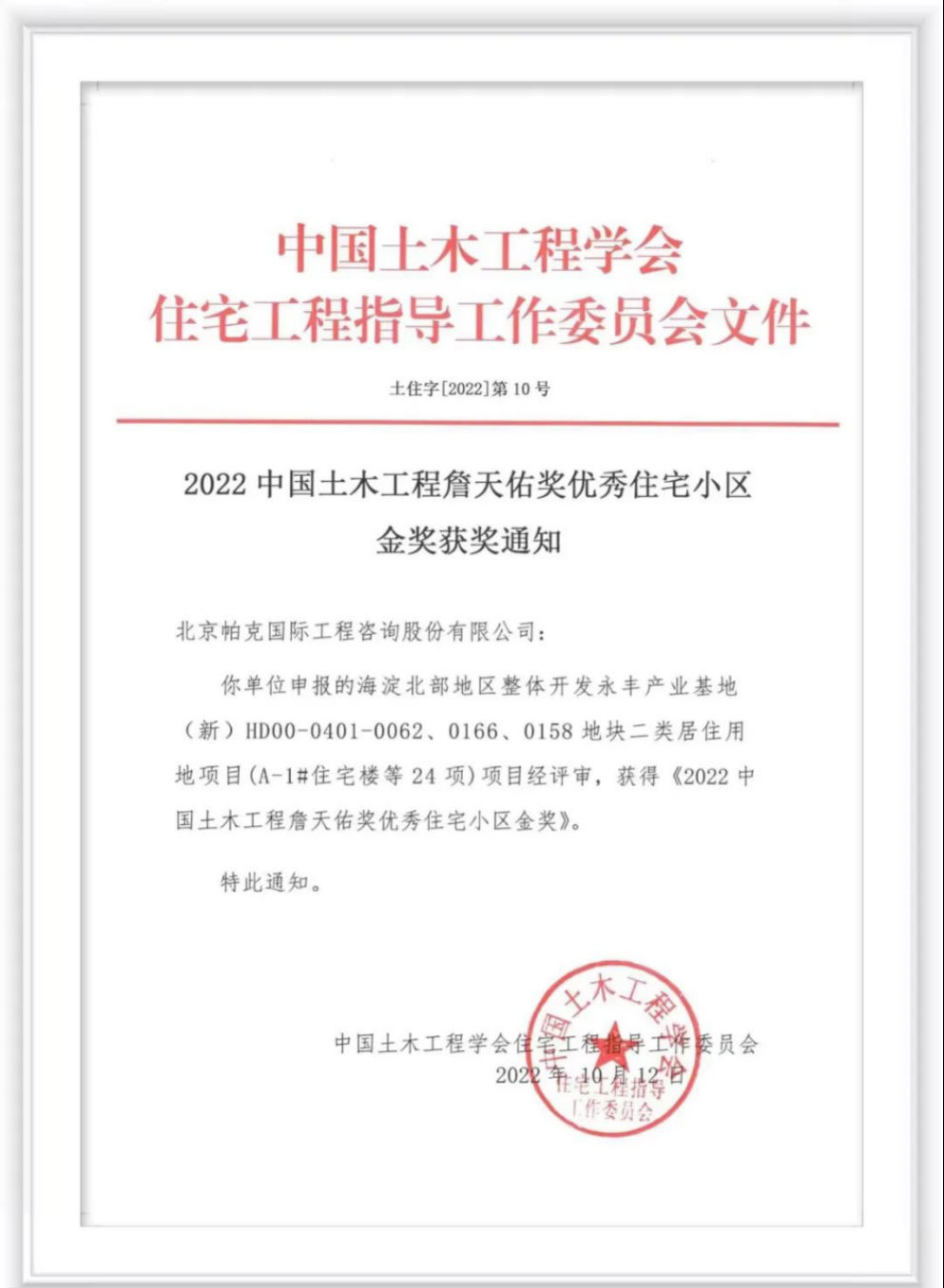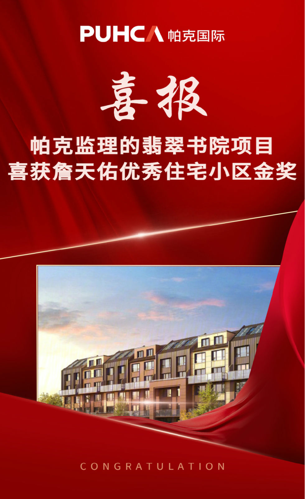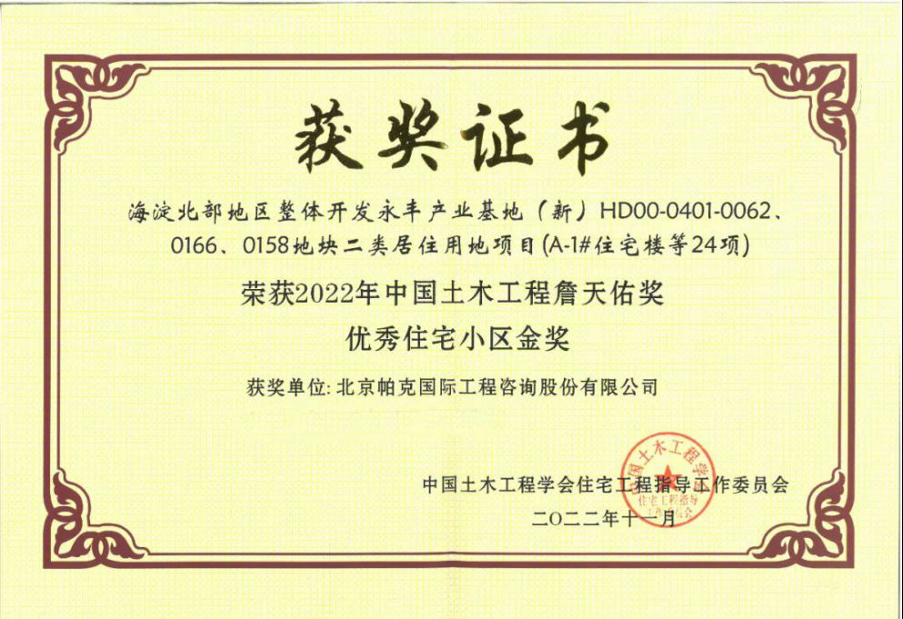 帕克监理的翡翠书院项目喜获“2022年詹天佑优秀住宅小区金奖”