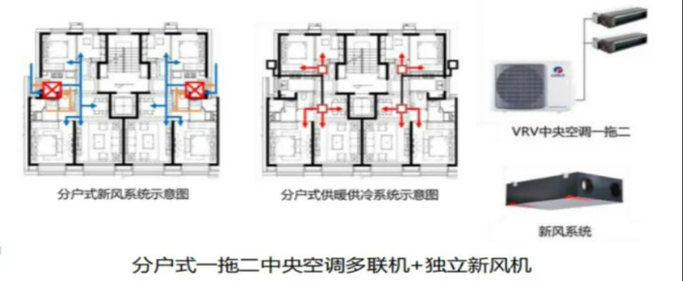[1] 分户式一拖二中央空调多联机+独立新风机:超低能耗建筑的分户式辅助供暖供冷系统形式有多种,通过总结以往经验,本项目采用分户式一拖二中央空调多联机+独立新风机。该系统造价较低,且每户只需一个空调板,节省市政供暖接入费和小区内供暖管网建设,冷暖和新风完全由用户自行控制便于分户计量,风管尺寸小,对层高要求不高。