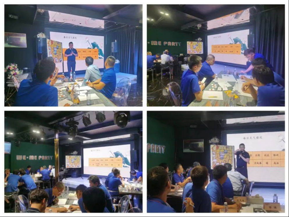 再次,四组队员在主持人的组织下进行“沙漠掘金”素质拓展活动。活动开始,四个小组分别组成了自己的“探险小分队”,根据沙漠掘金的规则,大家各司其职、通力协作,积极规划路线,筹备水和食物,购买帐篷,在有限的时间和多变的天气内抉择出一条最为合理的行进路线。活动中,大家通过掘金之旅体会到了凝聚的力量,彼此间不断表达自我感受和想法,体会团队中从回避到冲突,再到沟通、了解、合作的发展历程;积极的沟通讨论,汲取了团队的力量。最终,“冲天炮队”赢得本次“沙漠掘金冠军队”。
